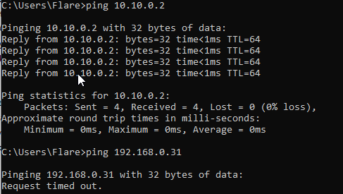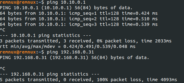 Booting up both boxes first i checked that they could communicate with each other, but not with the outside world or the host.