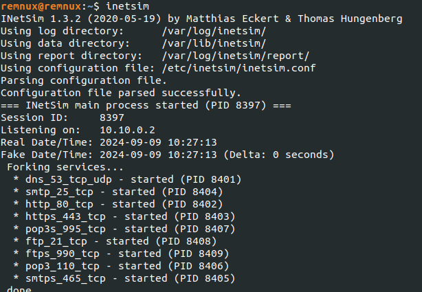 Next I ran INetSim on remunux to check dns was working correctly (flare uses remnux as the DNS server in order for remnux to capture web traffic for examination with wireshark)