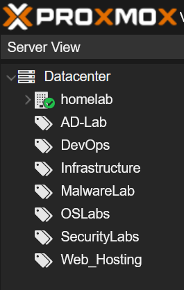 SecurityLabs = This is a bit of a mess at the moment and contains my SocLab, a Splunk instance, an ELK stack, my Kali VM, and a handful of other security related VMS. Ideally this would be split into 3 groups, the SOC labs, the DFIR labs and my CTF boxes. Need to stick my CTI stuff in here too but that takes up way too much disk space and needs some planning.