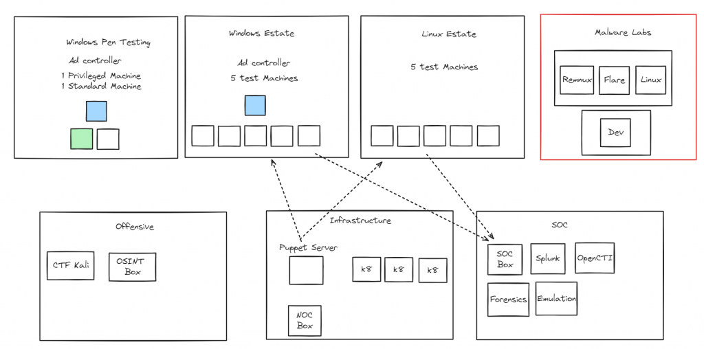 Both the windows estate and the linux estate will be controlled by puppet, and feed log data into Soc Box (puppet will also push the siem agents/ XDR).